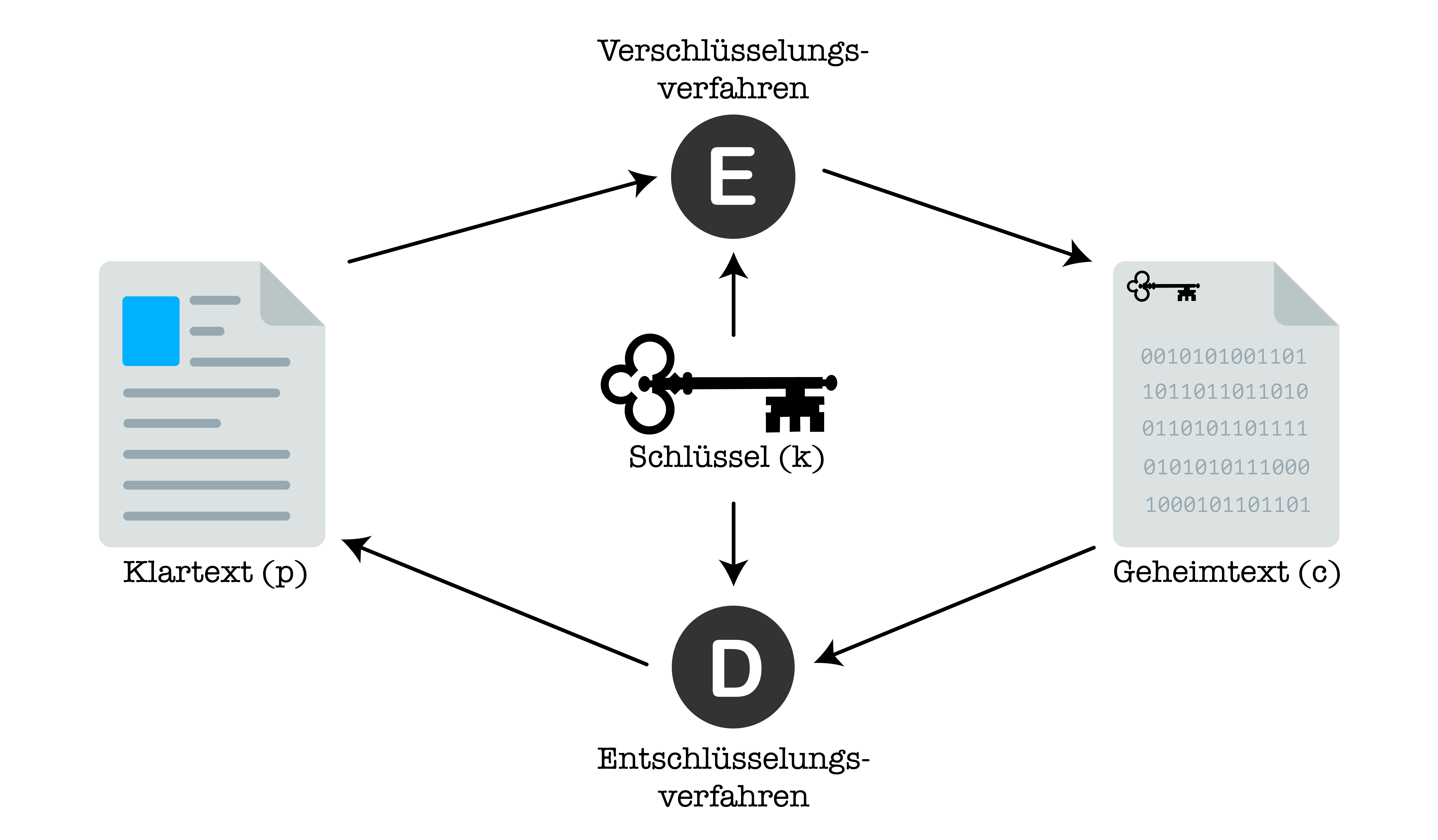 Um einen Klartext in einen Geheimtext umzuwandeln, benötigen wir einerseits einen Schlüssel (, engl.: key) und andererseits einen Algorithmus, der den Klartext unter Verwendung des Schlüssels in Geheimtext umwandelt. Diesen Algorithmus bezeichnen wir als Verschlüsselungsverfahren oder Verschlüsselungsalgorithmus, abgekürzt (engl.: encryption algorithm). Damit wir eine verschlüsselte Nachricht aber auch wieder entschlüsseln können, brauchen wir zudem noch ein dazugehöriges Entschlüsselungsverfahren, resp. einen Entschlüsselungsalgorithmus (, engl.: decryption algorithm). Ein Paar aus zwei solchen Algorithmen bezeichnen wir dann als eine Chiffre, wenn die unter Verwendung desselben Schlüssels 1 die Umkehroperation von ist.