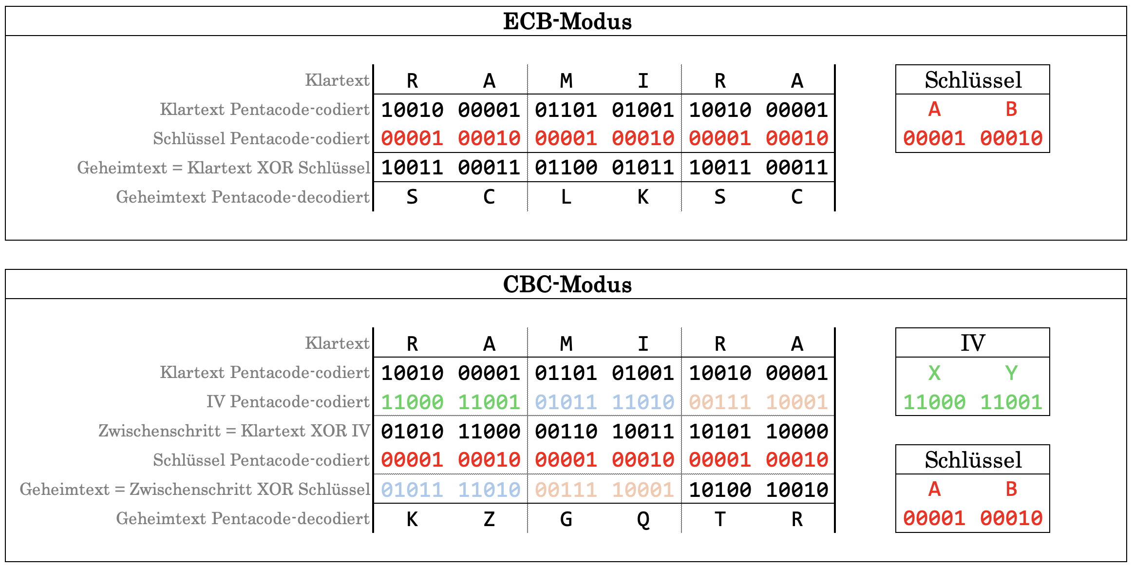 Dieses Beispiel zeigt, was die Verkettung von Blöcken ausmachen kann. Bei beiden Modu werden zwei identische Klartextblöcke RA mit dem Schlüssel AB verschlüsselt.