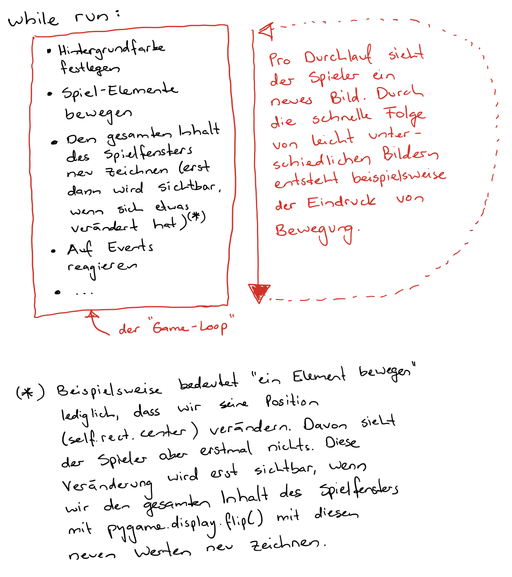 Bei jedem Durchlauf des Game-Loops wird der Ball also um einen "Schritt" bewegt, und zwar abhängig von seiner Richtung. Nun ist die Frage: wie oft wird dieser Game-Loop ausgeführt? Die Antwort dazu finden wir auf der Zeile 40. Hier greifen wir auf die Clock (also, die "Spieluhr", den "Timer") zu, die wir auf Zeile 18 bei Pygame holen und in der Variable clock abspeichern. Auf Zeile 40 sagen wir clock.tick(100). Das bedeutet, dass das Spiel mit 100 frames per second (FPS, Bilder pro Sekunde) laufen soll. Dem Spieler wird also nach folgendem Schema 100x pro Sekunde ein neu berechnetes Bild gezeigt: