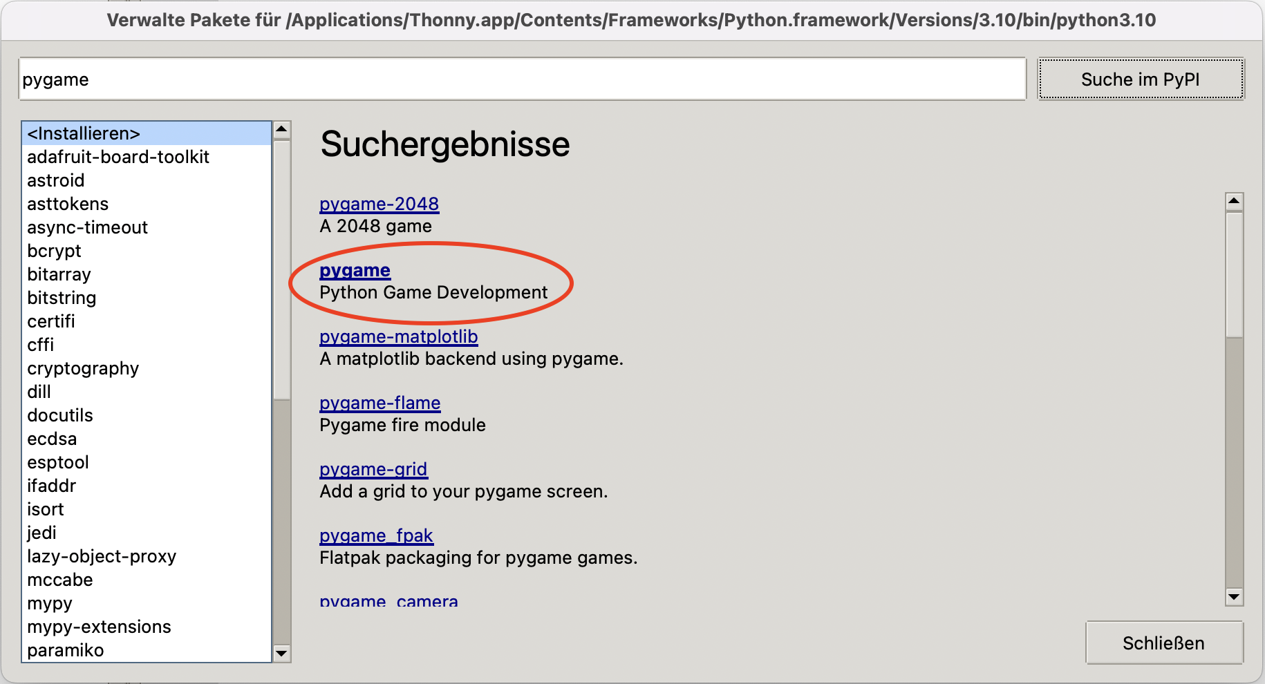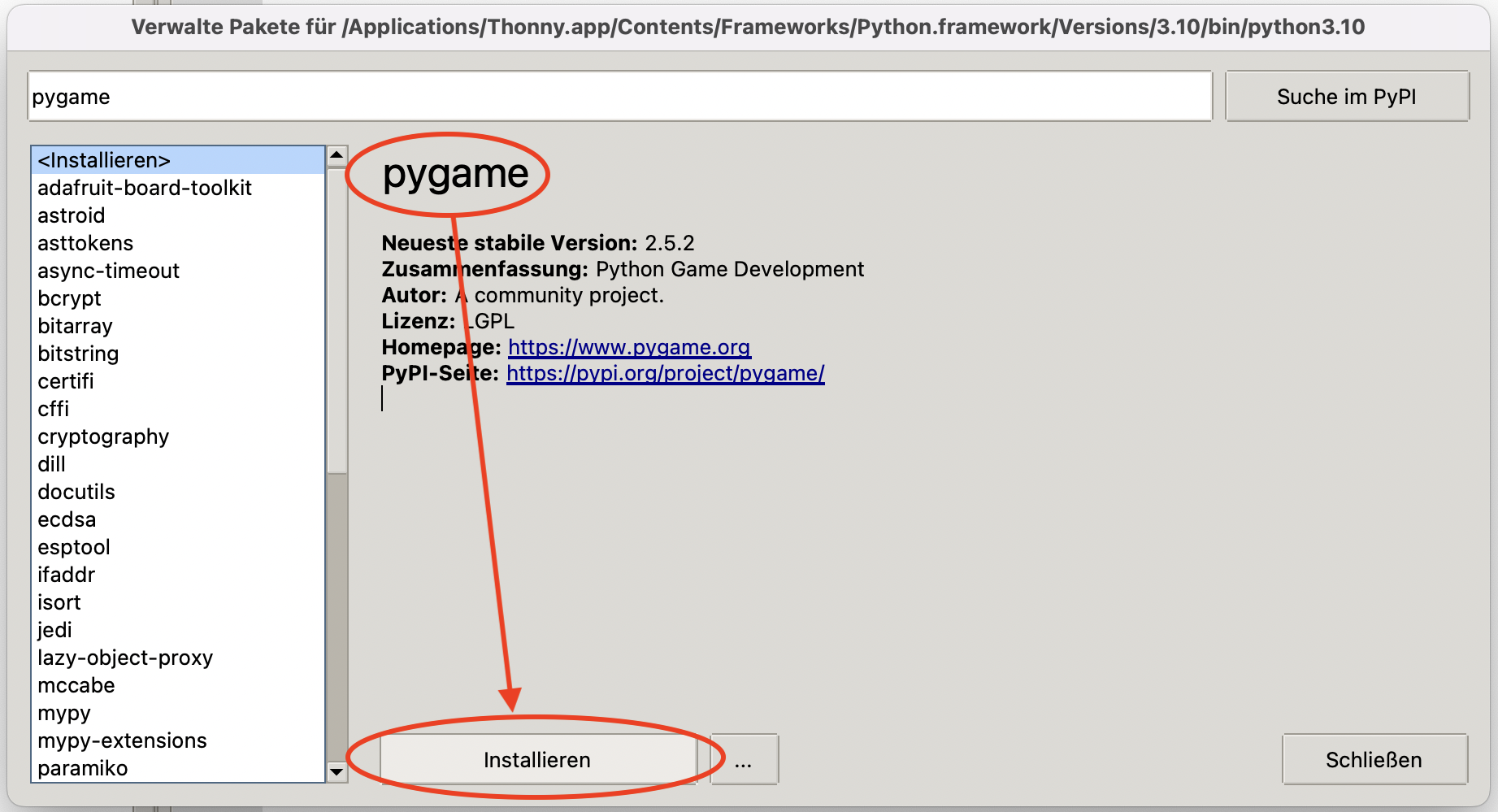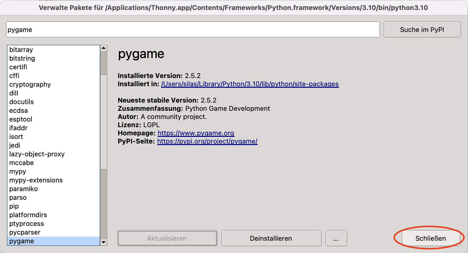 pygameinstalliert ist, klicken Sie auf schliessen: