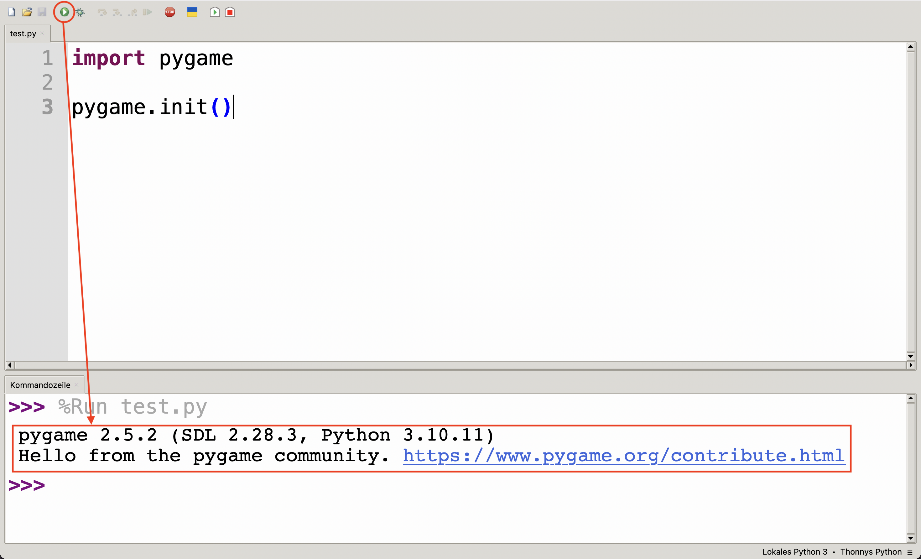 Sofern Sie diese Ausgabe sehen, haben Sie pygame erfolgreich eingerichtet. Die Datei test.py brauchen Sie jetzt nicht mehr.