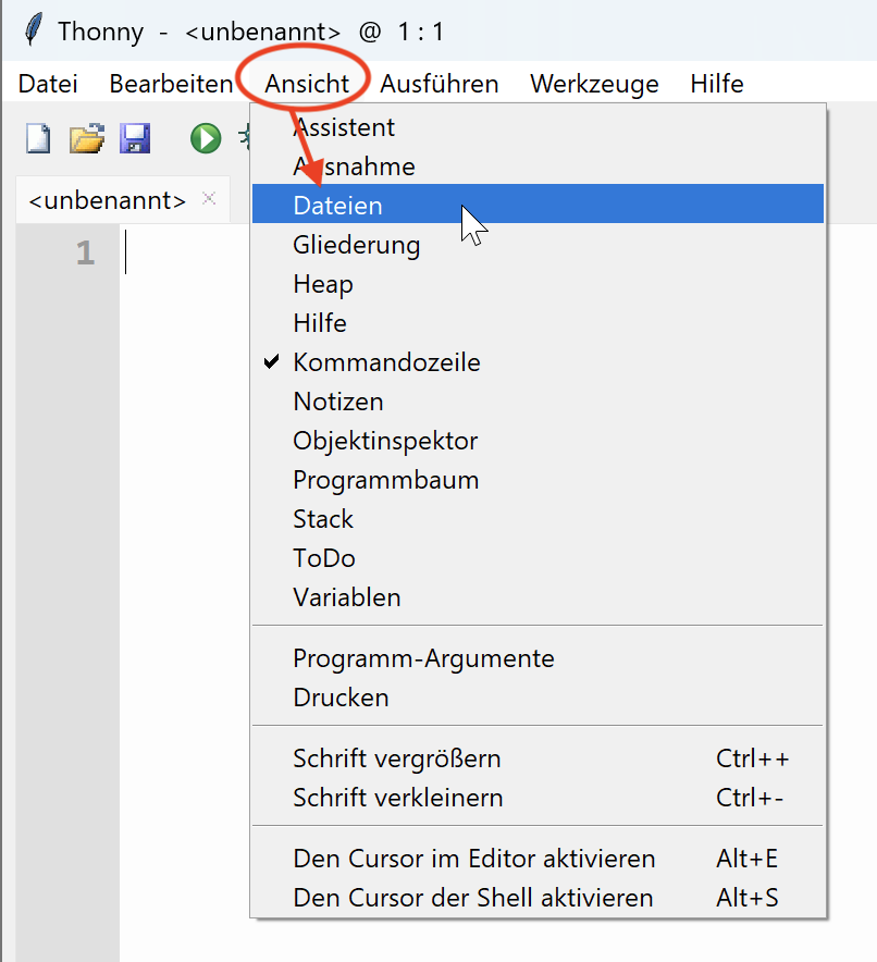 Stellen Sie zuerst sicher, dass in Thonny am linken Rand Bereich Dateien angezeigt wird. Sollte dieser Bereich bei Ihnen fehlen (wie im Bild unten), dann blenden Sie ihn folgendermassen ein: