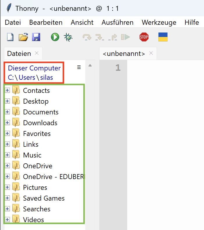 Im Bereich Dateien sehen Sie dann einerseits den Pfad des Ordners, in dem Sie sich gerade befinden (rot markiert). Andererseits sehen Sie eine Liste aller Dateien und Ordner, die sich in diesem Ordner befinden (grün markiert).