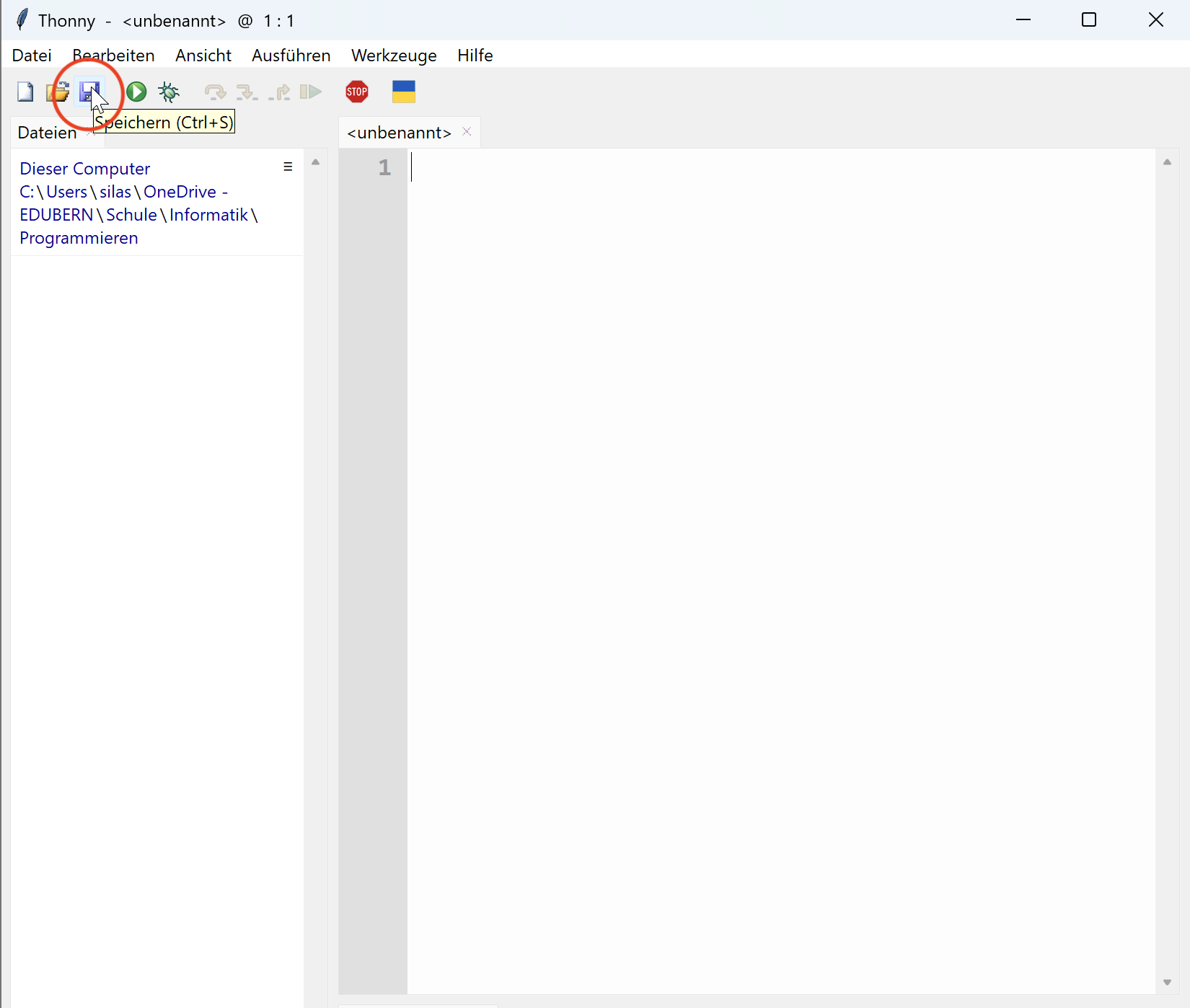 Um die aktuell offene Datei zu speichern (wenn sie noch nich gespeichert ist), klicken Sie im Menuband oben auf das Speicher-Symbol: