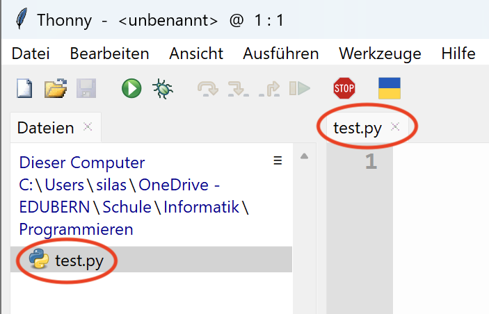 Wenn Sie keine Dateiendung angeben, wird Thonny automatisch die Endung .py (für Python) hinzufügen. Wenn Sie eine andere Dateiendung verwenden wollen (z.B. .html), dann müssen Sie diese im obigen Schritt explizit beim Namen angeben (z.B. test.html, statt nur test).